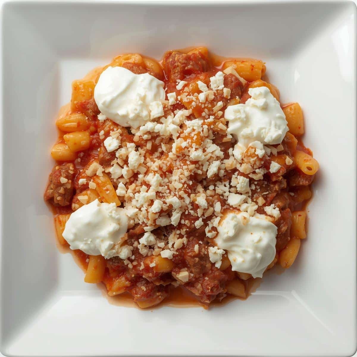 Pâtes Grecques, sauce tomate à la viande hachée avec feta et yaourt