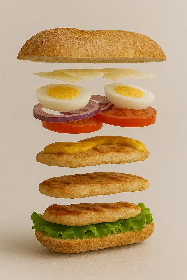 Vous démarrez avec un pain blanc tout frais, puis vous composez votre sandwich couche par couche, selon vos envies : une protéine généreuse, des crudités croquantes, une sauce savoureuse et quelques extras pour la touche finale.